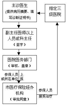 2.参保人员因患恶性肿瘤或尿毒症,需在门诊进行化学治疗,放射治疗或透析治疗的,肾移植手术后在门诊进行抗排异治疗的,由三级医院主诊医生提供病历摘要,提出诊治理由,填写《广州市职工基本医疗保险门诊特定项目诊断证明书》(一式二份),经副主任医师以上的人员或科主任签字,医院的医务部门审核盖章,由职工或所在单位报市医疗保险经办机构审批同意后,在指定的医院治疗。(具体见流程图)
