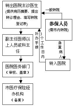 3.门(急)诊留观床位费,以不高于C级六人以上房间床位费为标准。转院治疗的规定参保人员因病情需要市内转院治疗的,须经本人就医的医院主诊医生提供病历摘要,提出转诊理由,填写《广州市职工基本医疗保险转院登记表》(一式二份),经副主任医师以上人员或科主任签字,由医院的医务部门审核盖章,报市医疗保险经办机构备案。急、危重病例急需转院的,可先行转院,3个工作日内由转出医院按规定到市医疗保险经办机构补办转院备案手续。(具体见流程图)